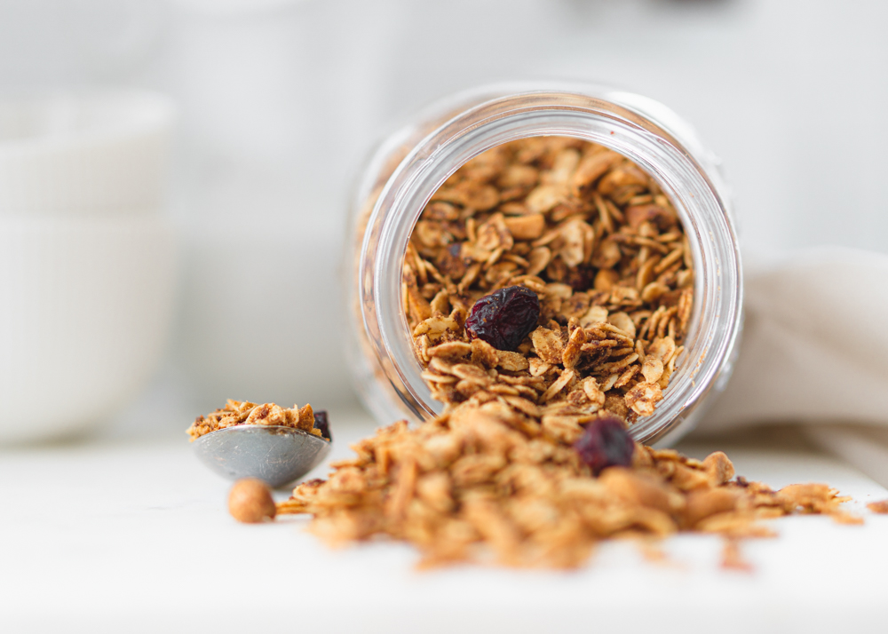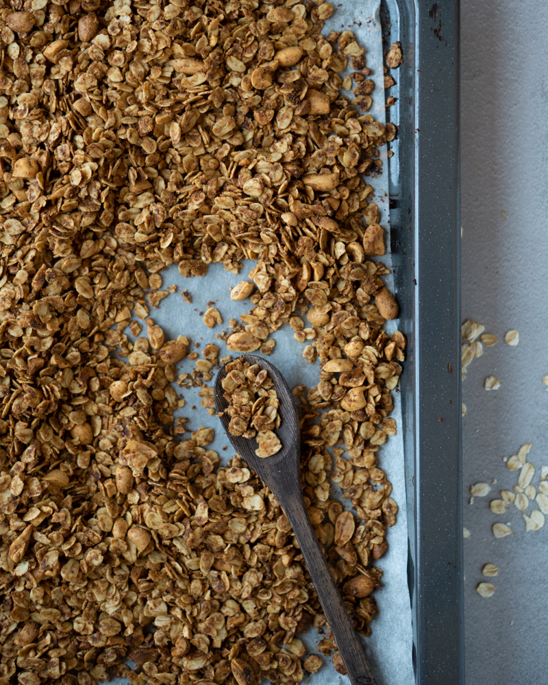 Compara dos fotos de granola: la primera es rápida, tomada con el móvil; la segunda está cuidadosamente planificada, estilizada y editada. ¿Ves la diferencia?